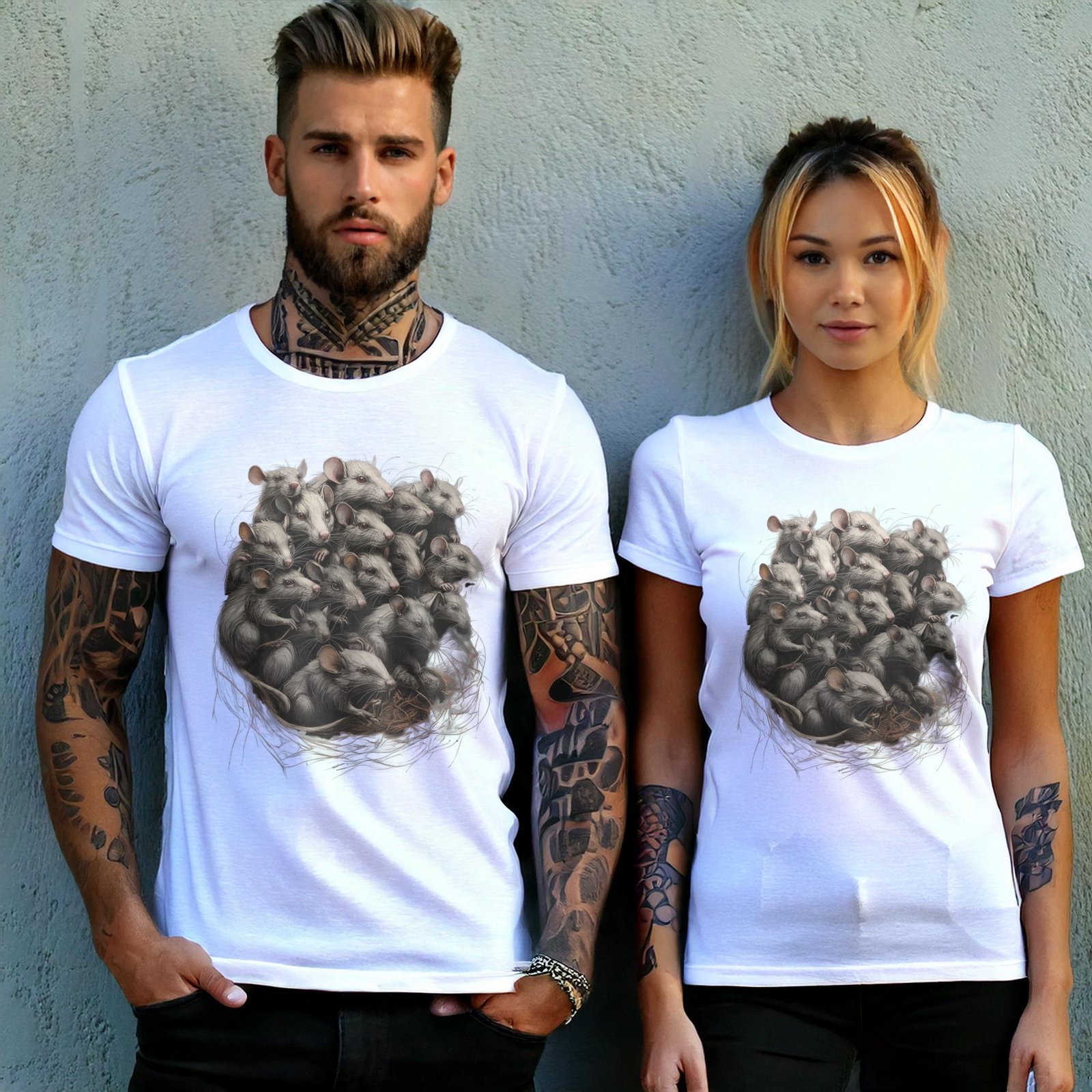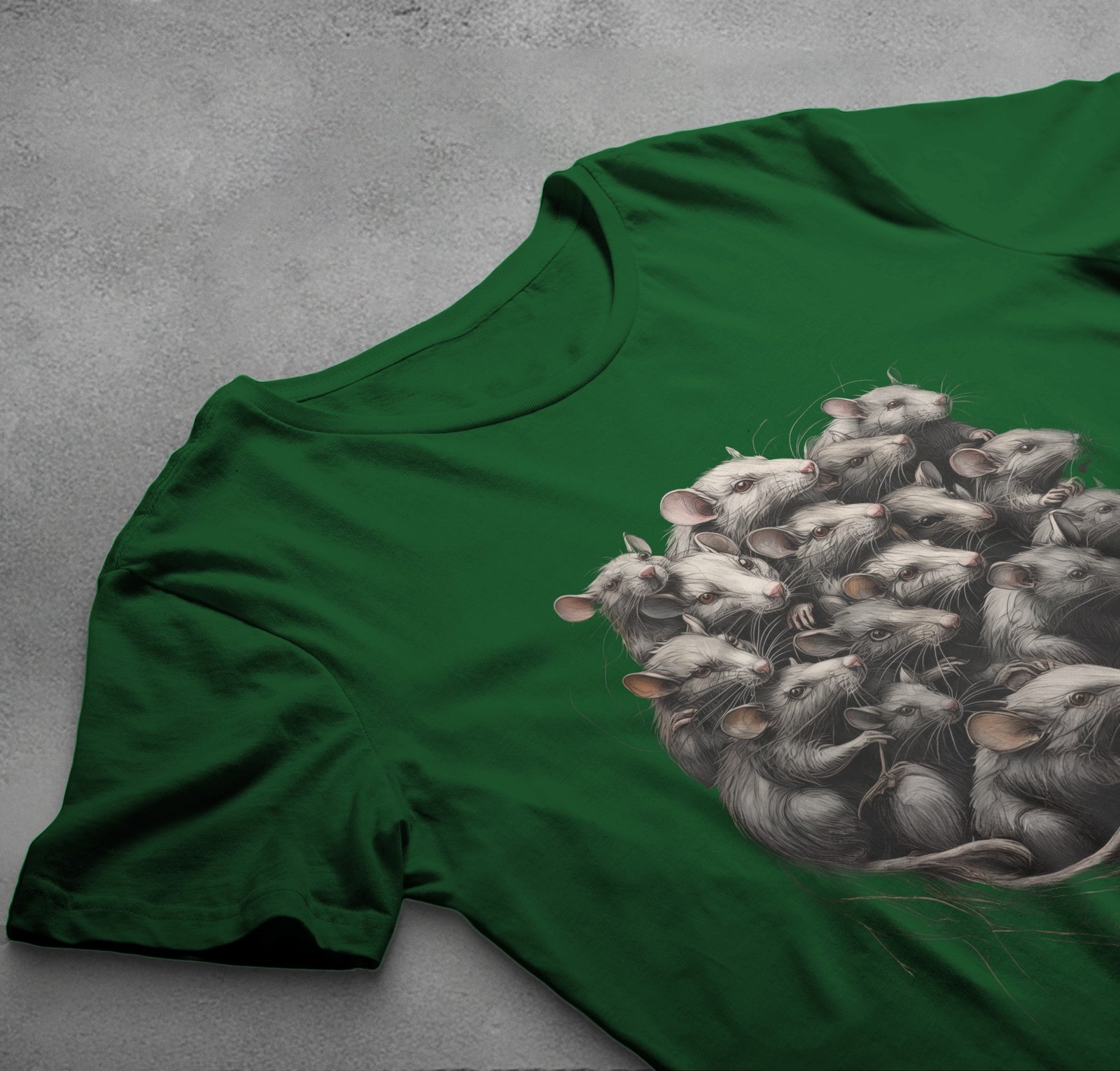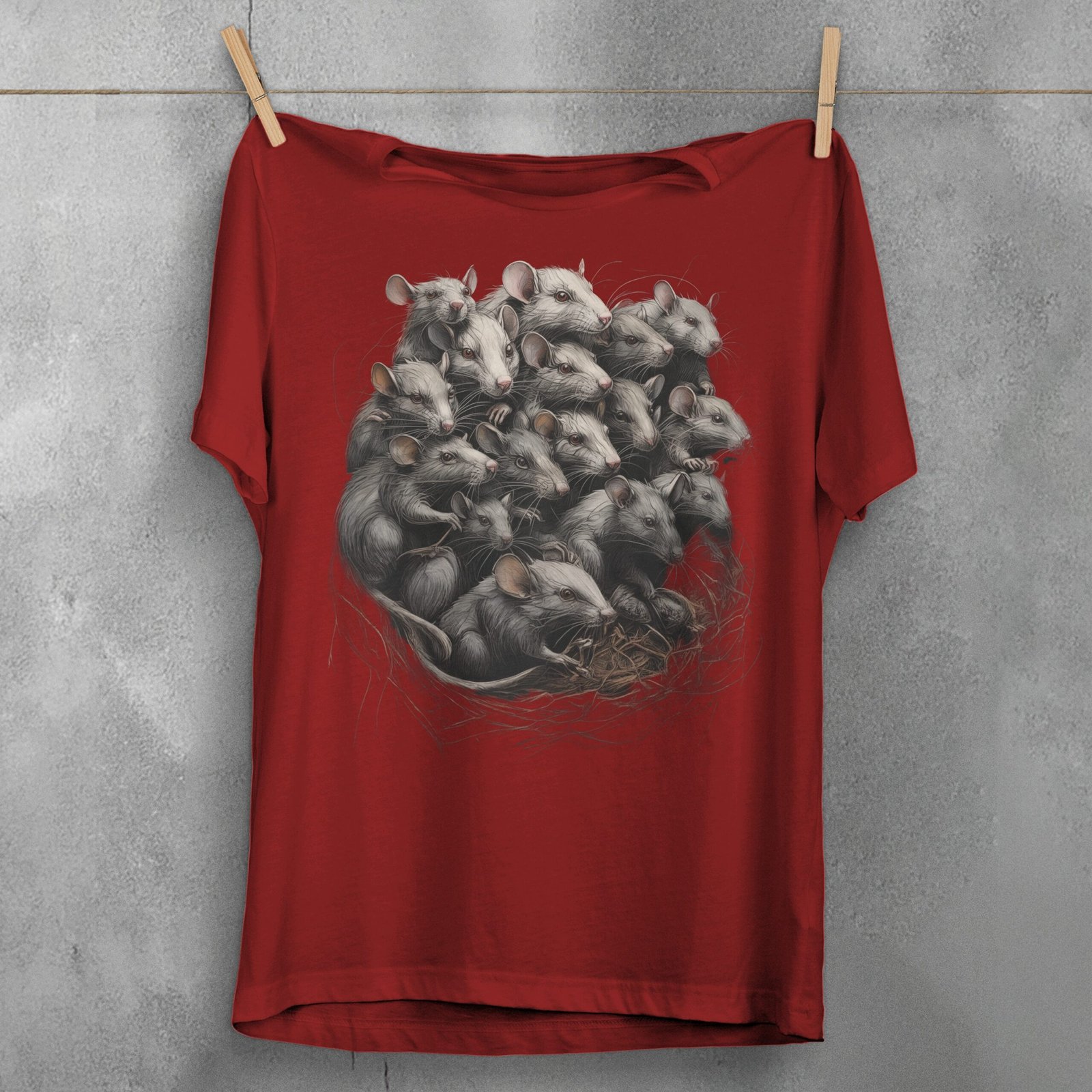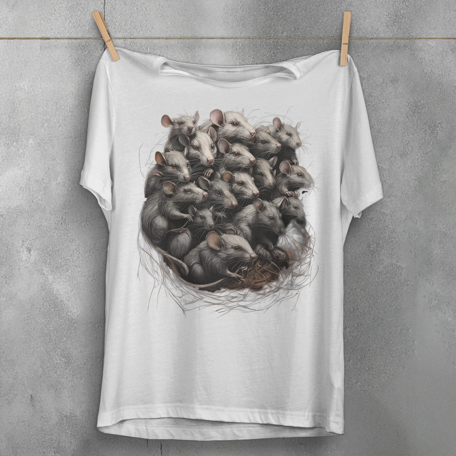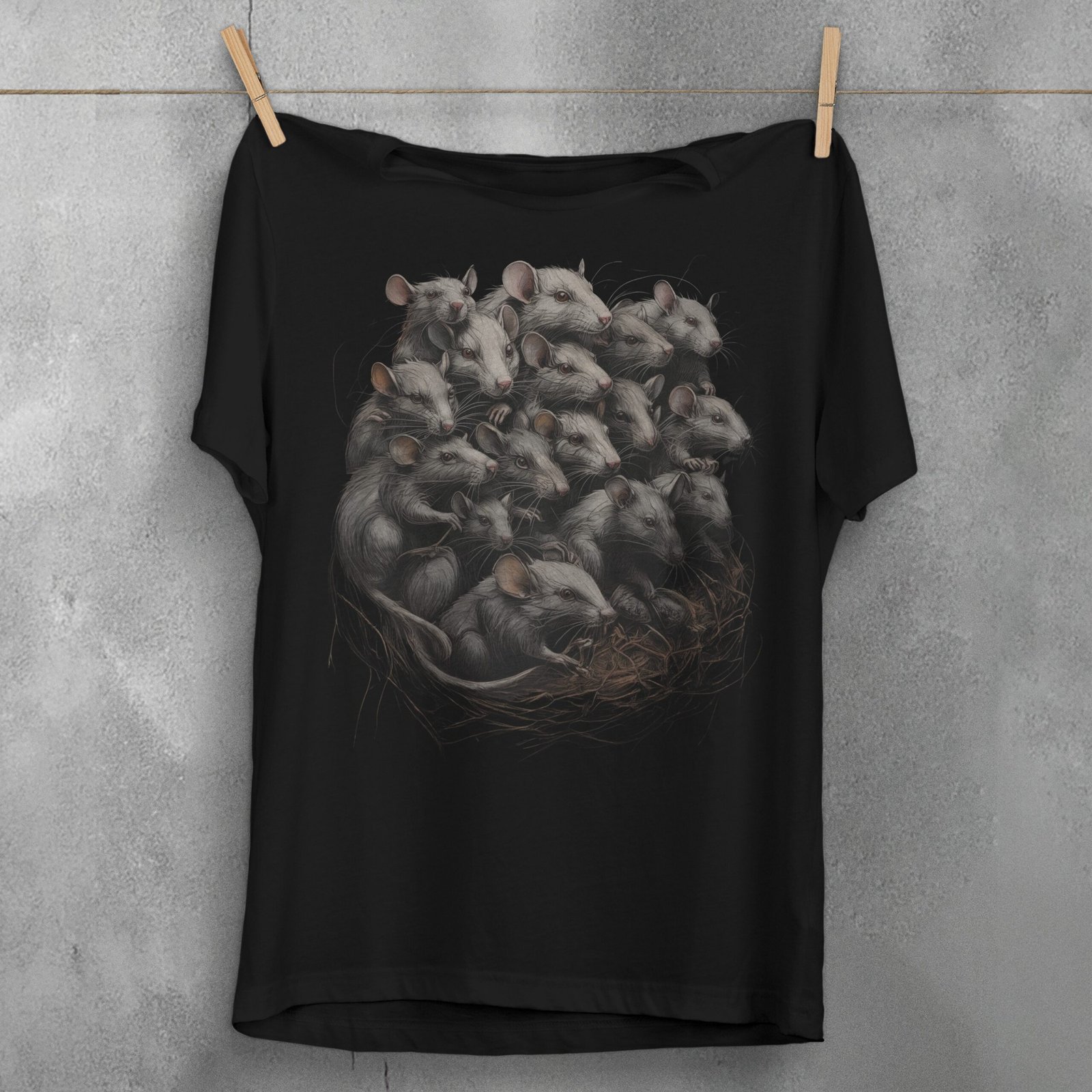 A captivating and eerie artwork, this design features a gathering of numerous mice intricately entwined in a nest. Each mouse is detailed with fine lines and a shadowy, almost spectral presence. The image evokes a sense of dark mystery and a touch of the macabre, capturing the viewer’s attention with its haunting assembly. Ideal for those who connect with gothic aesthetics, the composition speaks to the beauty found within the darker corners of nature. The depiction might resonate with individuals who appreciate the delicate balance between life and decay, order and chaos. The scene’s meticulous craftsmanship invites contemplation and whispers of untold stories within its intricate lines.