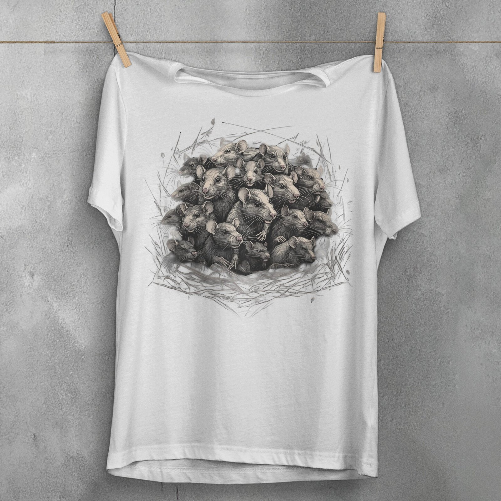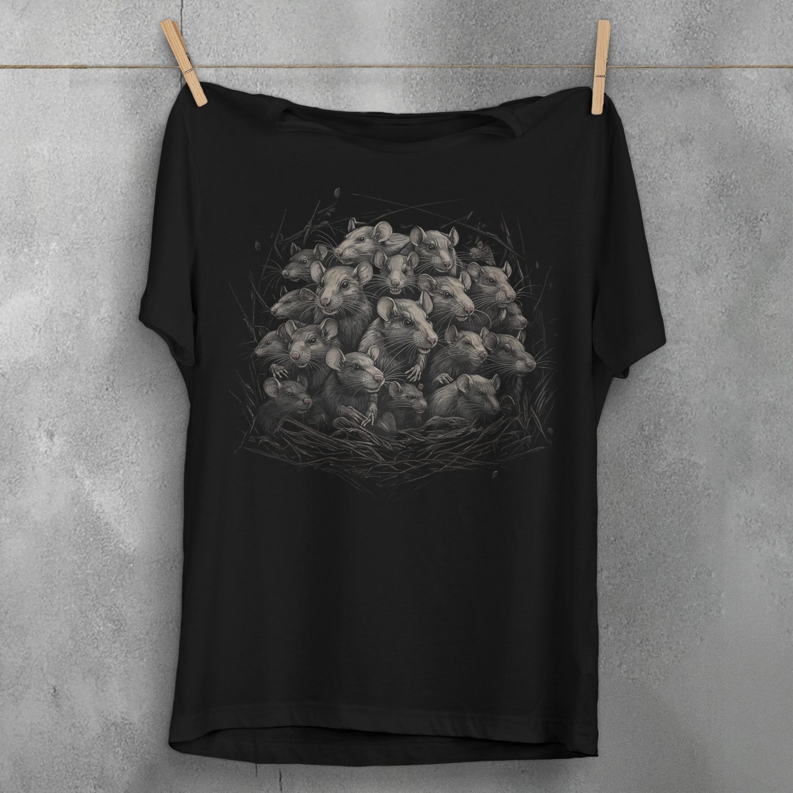 In a tangled nest of shadows, a multitude of rats nestle together, their eyes gleaming with secretive curiosity. This intricate artwork unfolds a sense of camaraderie within the unseen corners of the night. The detailed contrast between the light and dark fur creates a vivid, almost haunting display of unity and mystery. It’s an ode to those who find beauty and strength in the shadows, who cherish the uncanny and the overlooked. This mesmerizing scene might resonate deeply with those who walk their own paths and embrace the enchantment of the hidden. The intertwining rats suggest themes of community, resilience, and the delicate balance between fear and fascination. For those drawn to the gothic and the unusual, this image whispers of unseen worlds and the quiet power of the collective in the obscure.