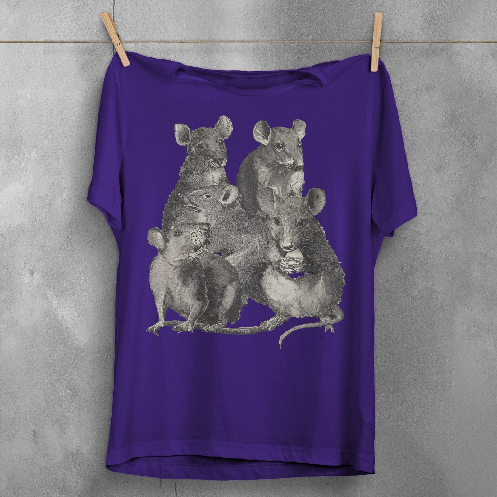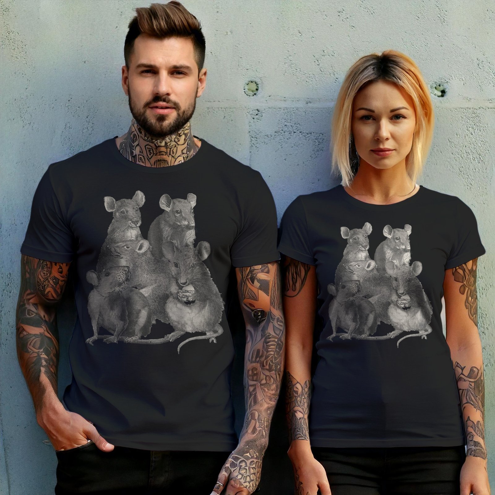 This gothic design captures the eerie elegance of five intricately detailed black rats gathered together, each with a hauntingly inquisitive expression. It evokes a sense of dark camaraderie among these often misunderstood creatures of the night. The atmospheric black and white illustration embodies a blend of mystery and subtle rebellion. Those drawn to the macabre, the secretive charm of the shadows, and the otherworldly nature of these nocturnal beings will find a kindred spirit in this artistic piece. Ideal for the witchy soul and the gothic aficionado, it whispers tales of hidden corners and quiet strength. The simple yet powerful imagery serves as a reminder of the beauty lurking in the unseen and uncelebrated. Embrace the enigmatic with this uniquely captivating design.