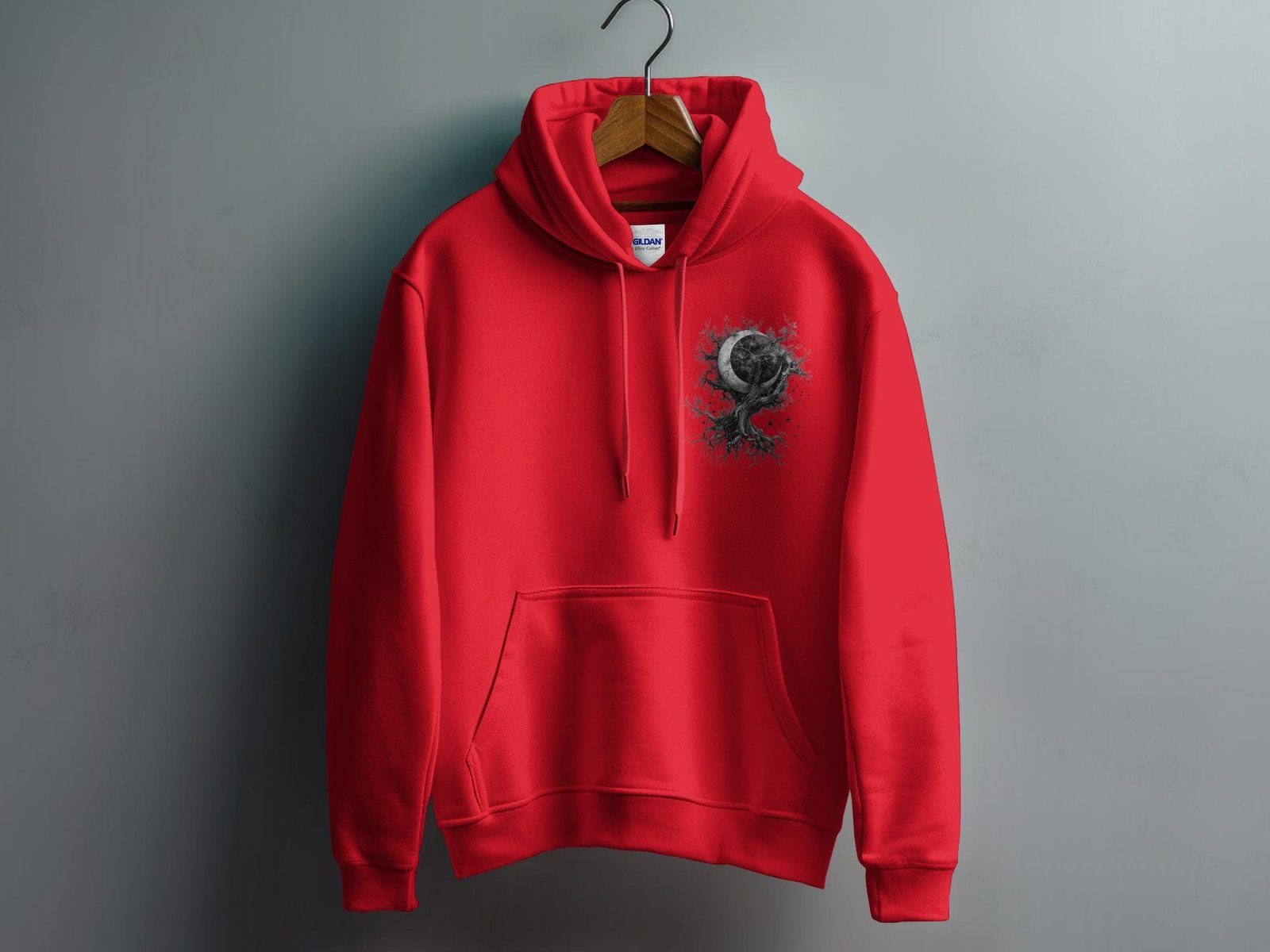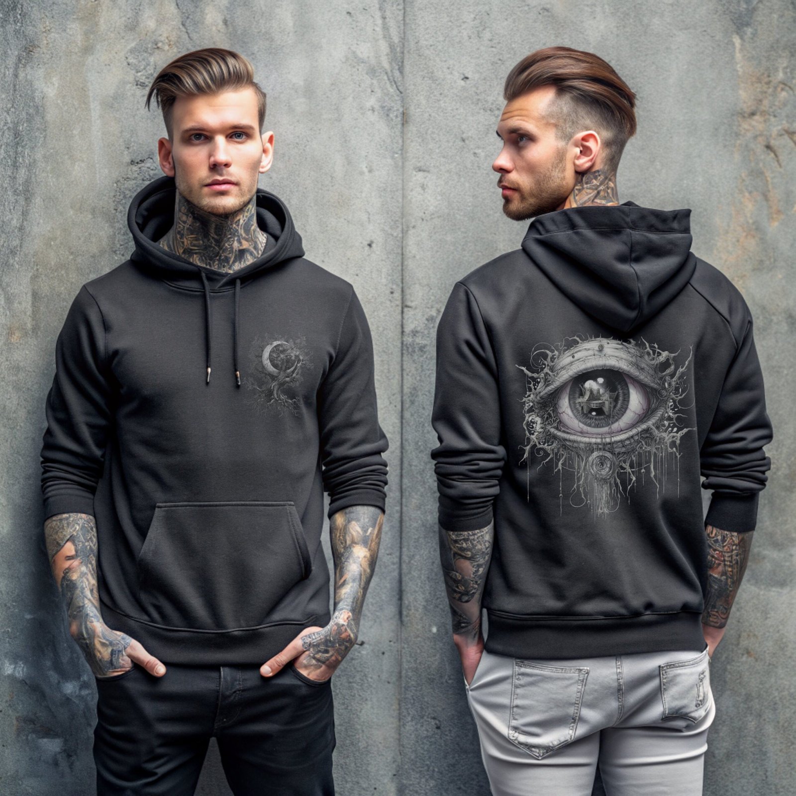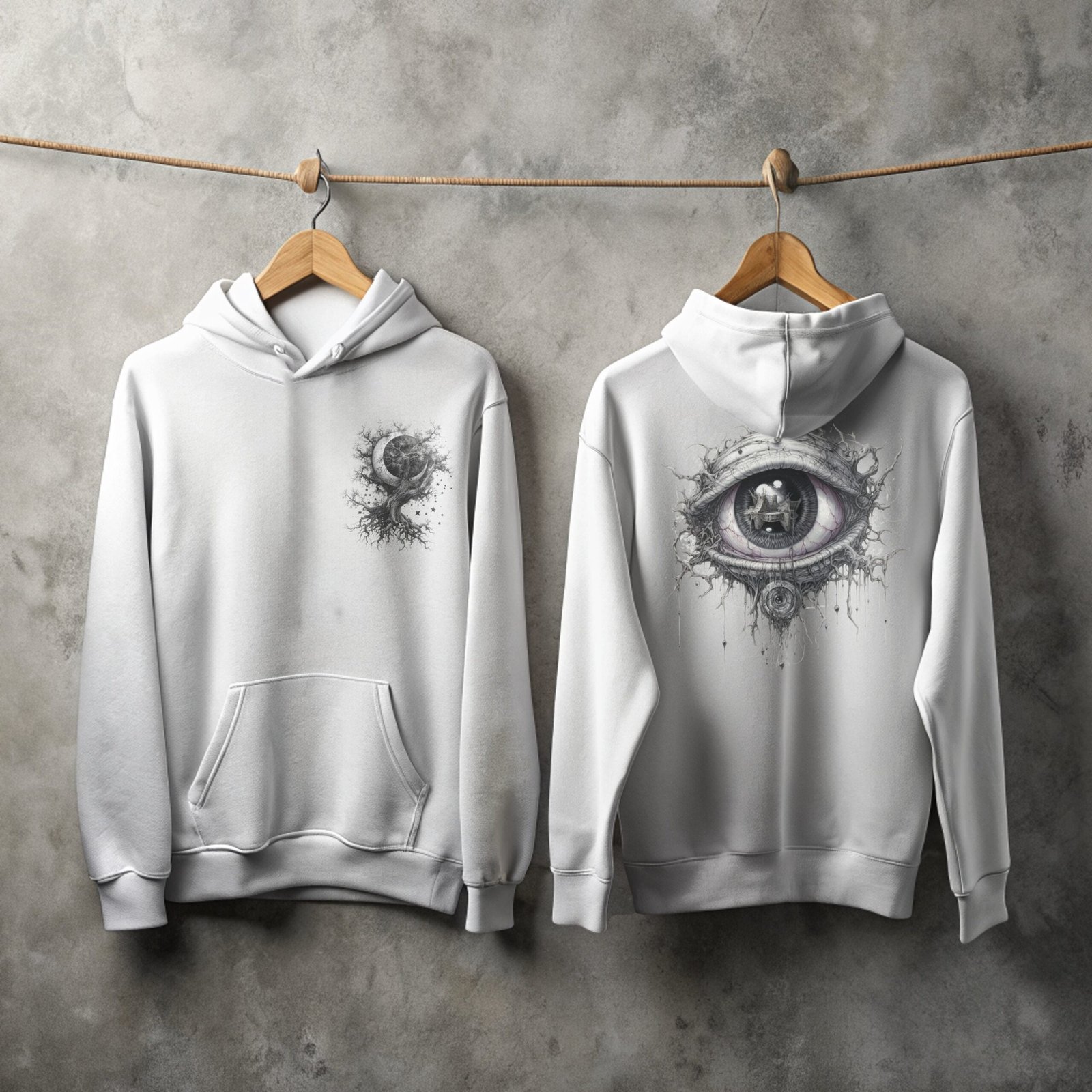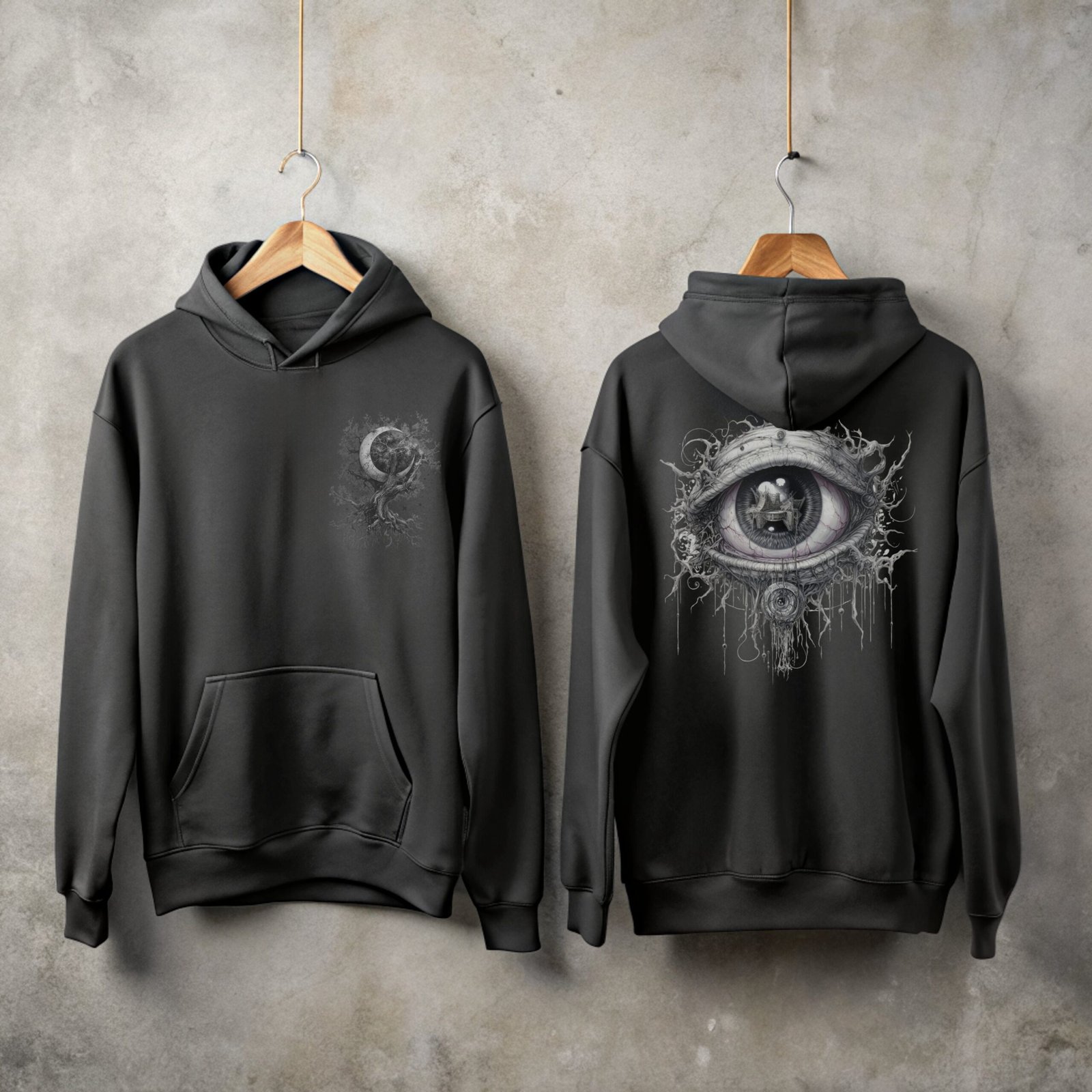 Unveil your inner mystic with this artistic gothic garment. The design features a witchy eye that peers into the soul, inviting introspection and hidden knowledge. On the front, a tree embraces a crescent moon, symbolizing growth under lunar influence. It whispers of ancient wisdom and connection to nature’s cycles. The intricate details and dark aesthetic resonate with those drawn to the occult. Embrace the shadows and illuminate your unique spirit. The artistry evokes feelings of enigmatic power.