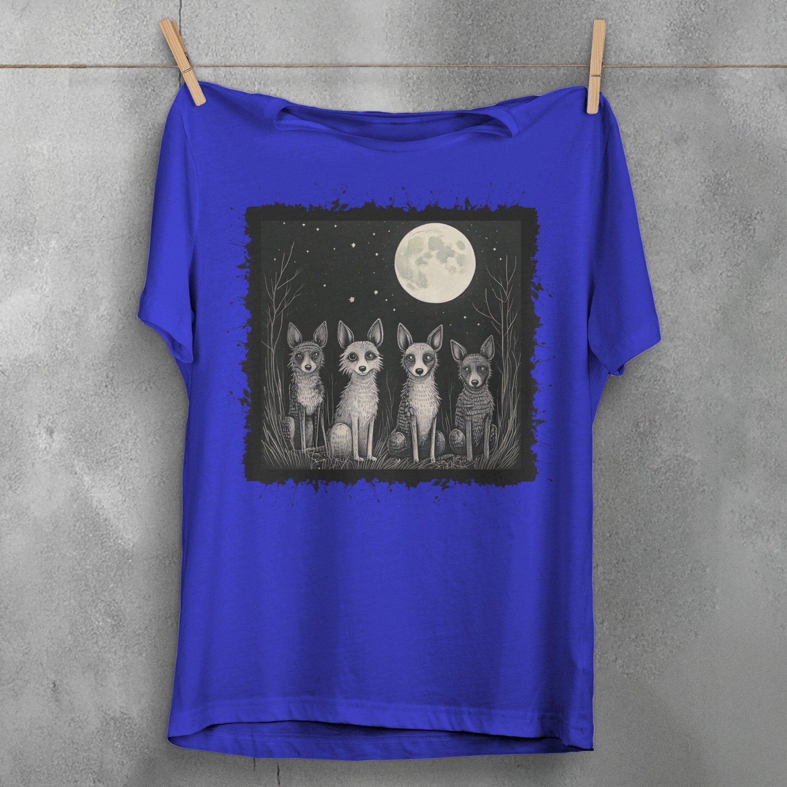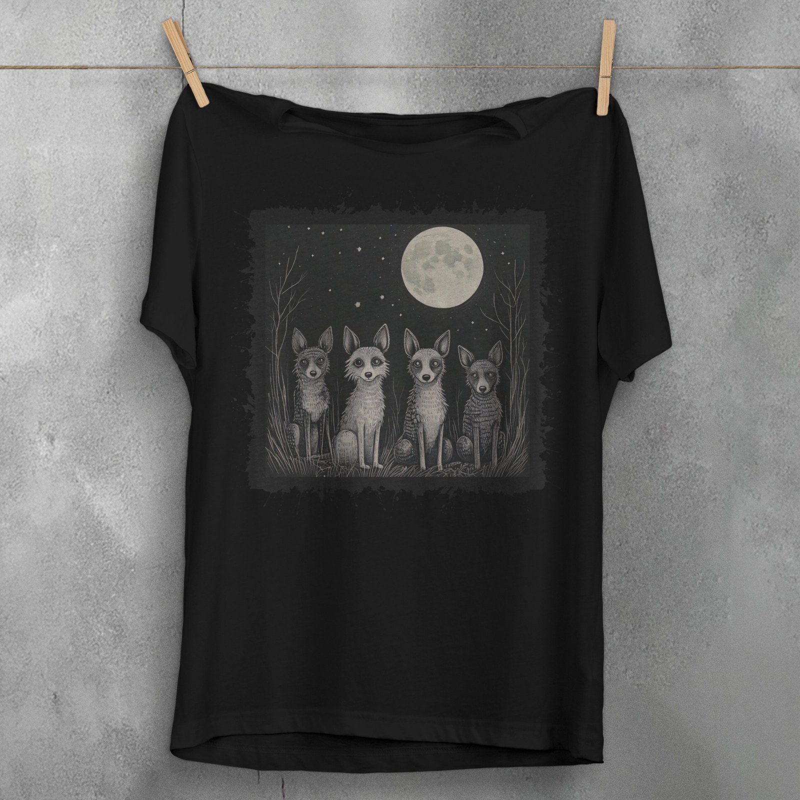 A gothic vision by TheOgham unfolds beneath a celestial moon. Four mystical canine figures sit within a starlit, monochrome realm. Shadows dance as thin branches reach skyward. This witchy tableau evokes a sense of ancient knowledge and wild magic. The art resonates with those who find beauty in darkness and mystery. It calls to the heart of the solitary soul, inviting contemplation under the watchful gaze of the moon.