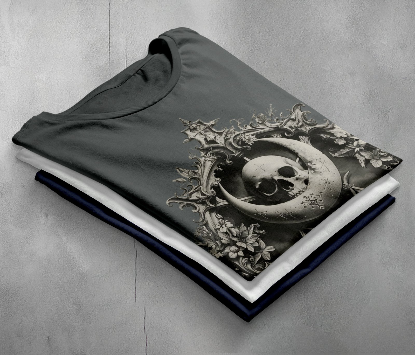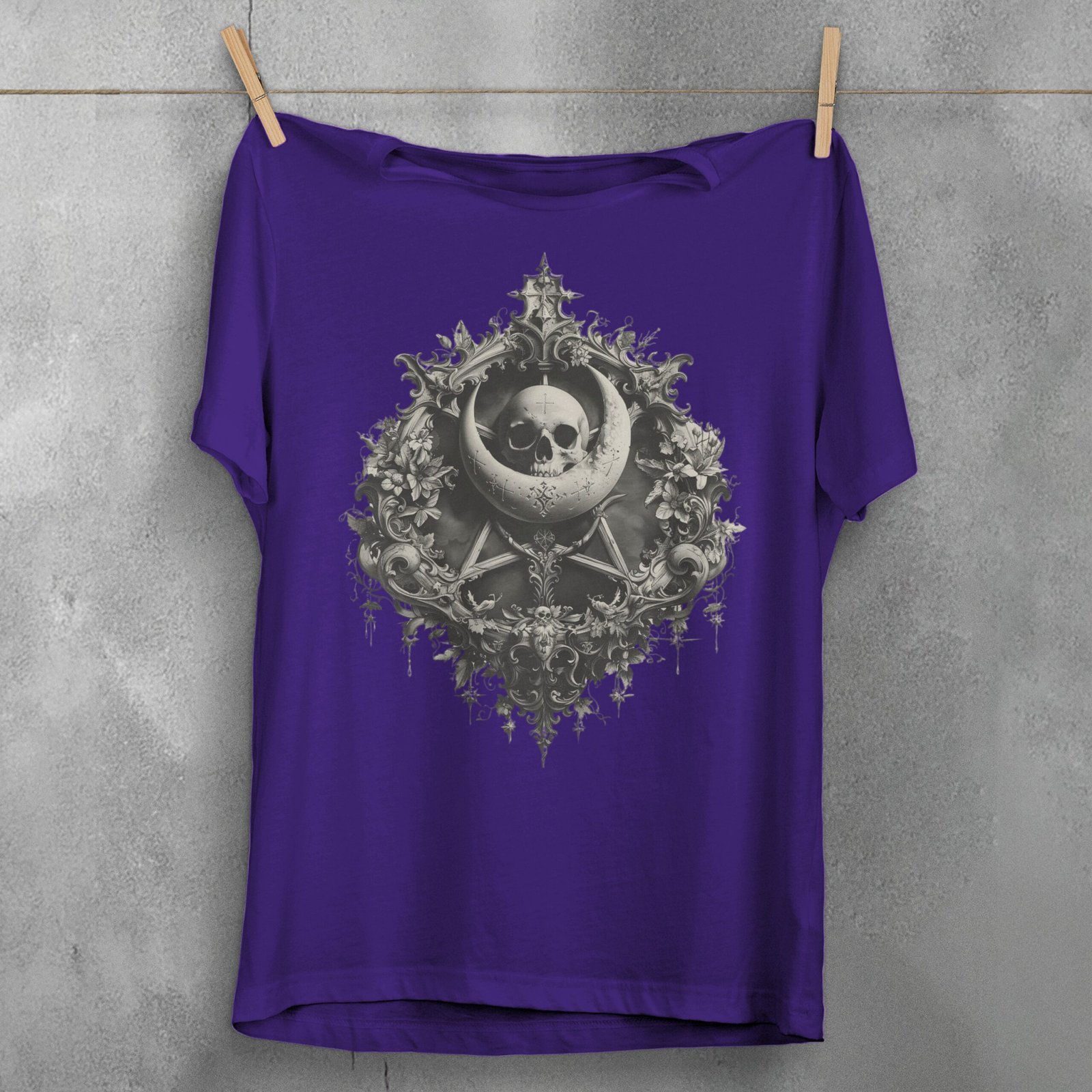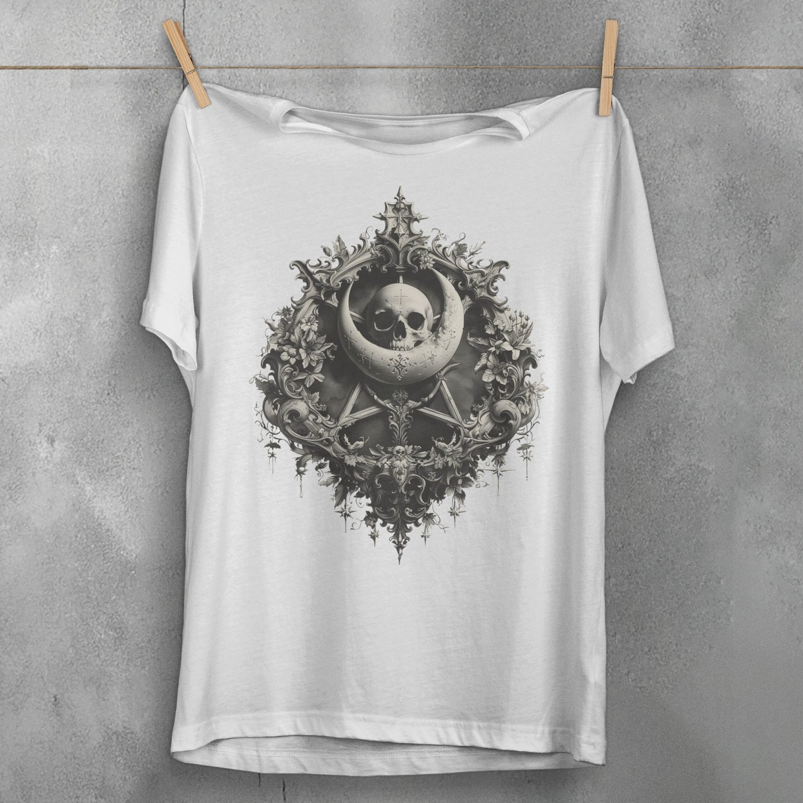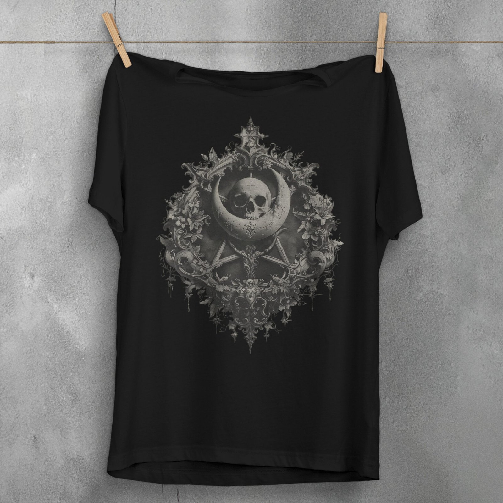 This gothic art evokes moonlight and arcane knowledge. The skull cradled by the crescent moon whispers of hidden paths. A pentacle anchors the ornate framework teeming with life and delicate decay. It speaks to witches and seekers who embrace shadow and mystery. Those drawn to dark academia or ethereal aesthetics will resonate. Find beauty in the macabre symbolism. This emblem reflects inner power and connection to the unseen realms.