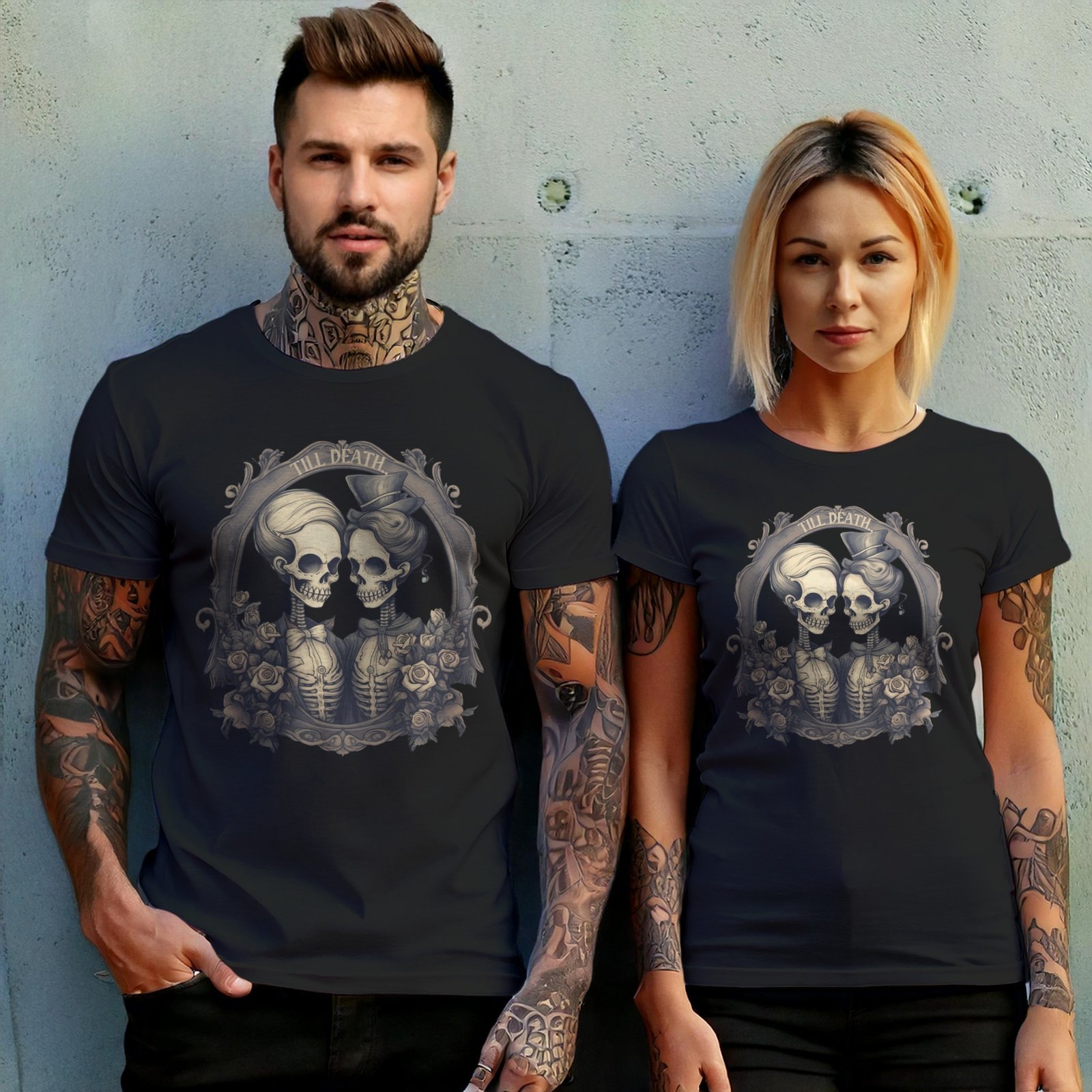Express eternal devotion with this gothic-inspired artwork by TheOgham. Witness a skeletal couple in formal attire, forever entwined within an ornate frame. Roses bloom around them, symbolizing an enduring love that transcends even death. The words “Till Death” arch above, a solemn vow. It speaks to souls drawn to the romanticism of the macabre. It’s a reminder of love’s persistent flame, a dark elegance for those who cherish eternal bonds.