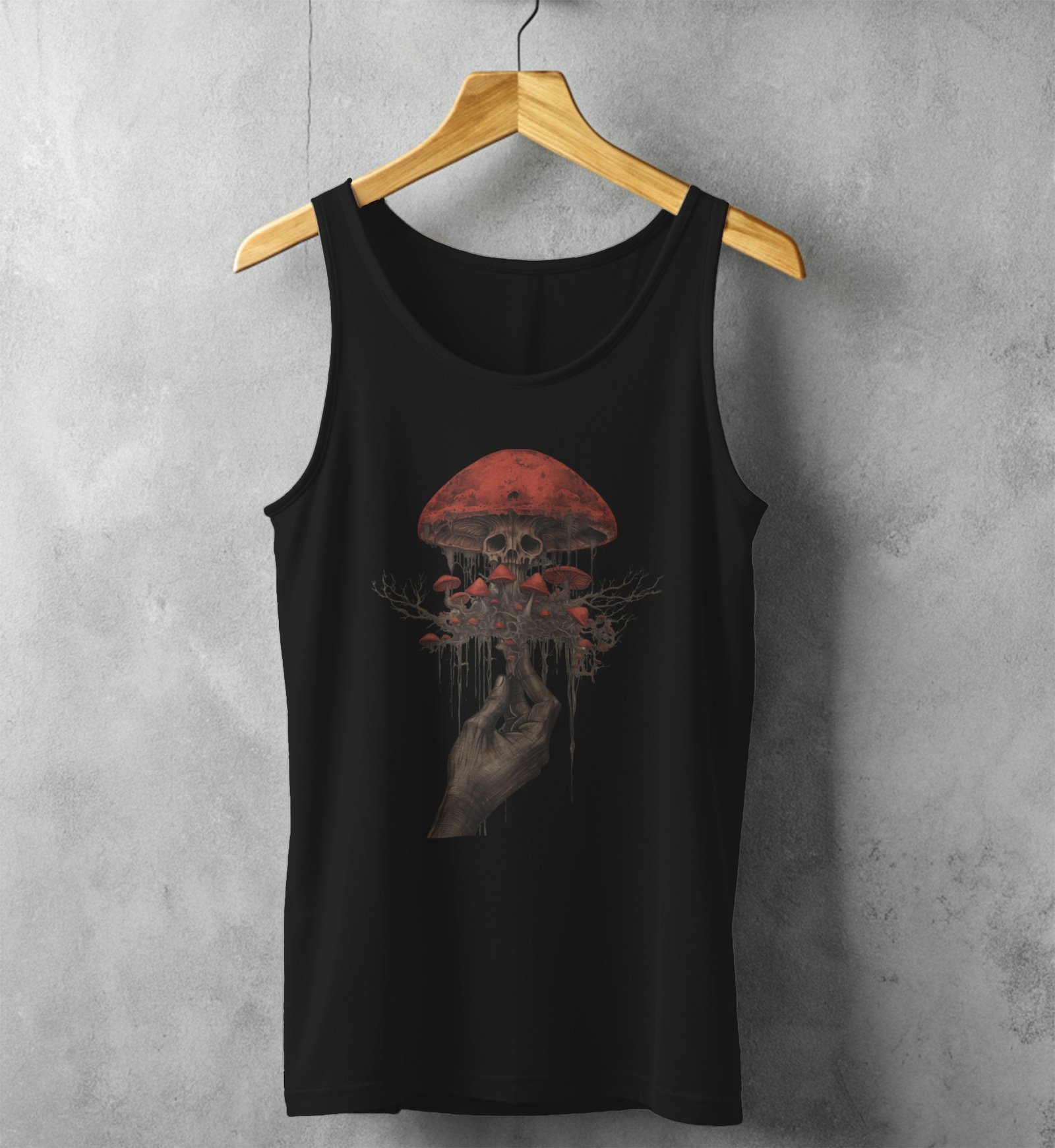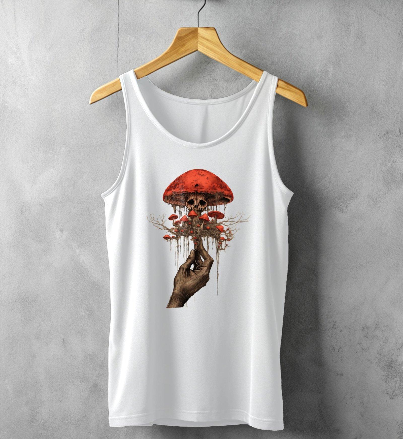 Hand holding skeletal fungi ethereal yet haunting aesthetic scene tank top