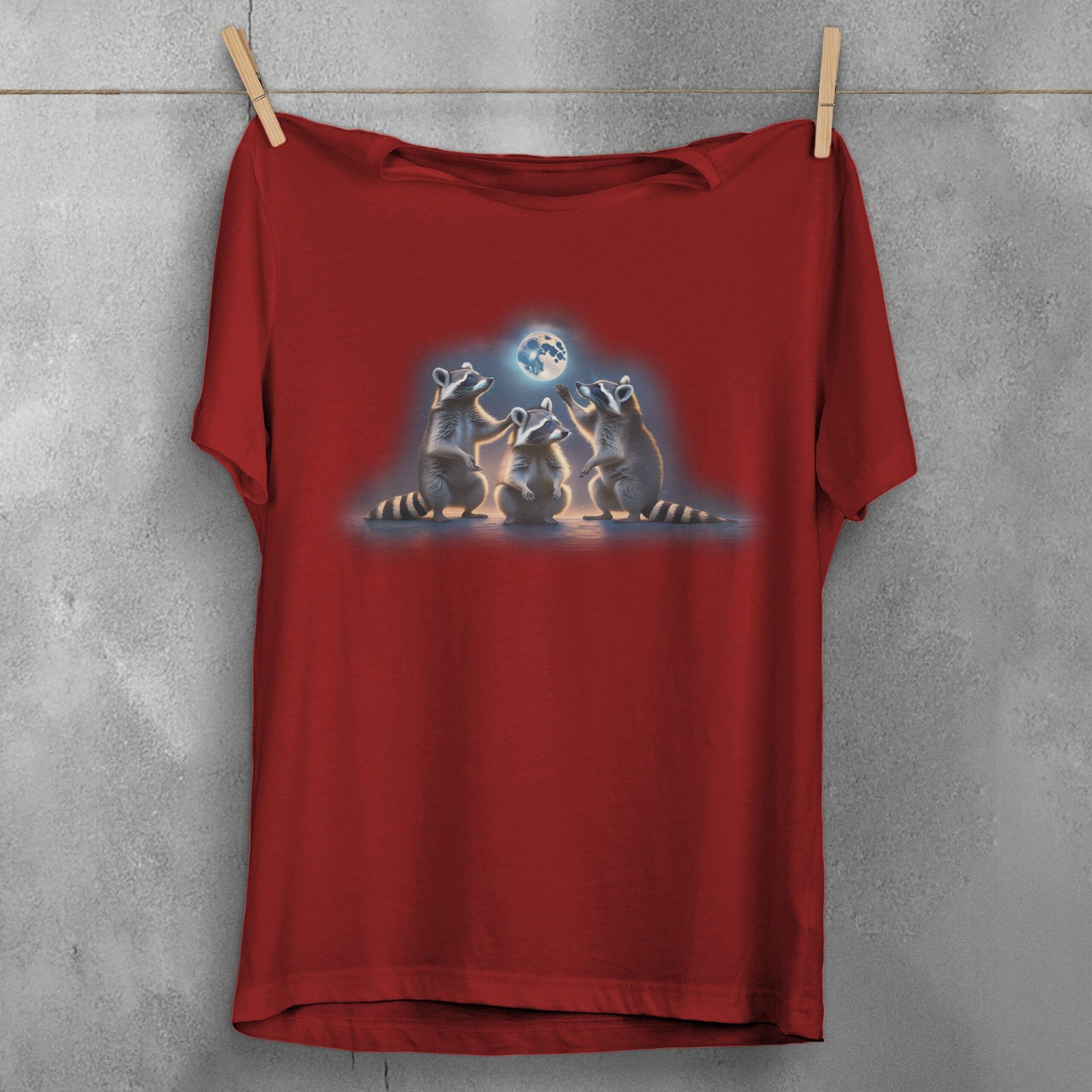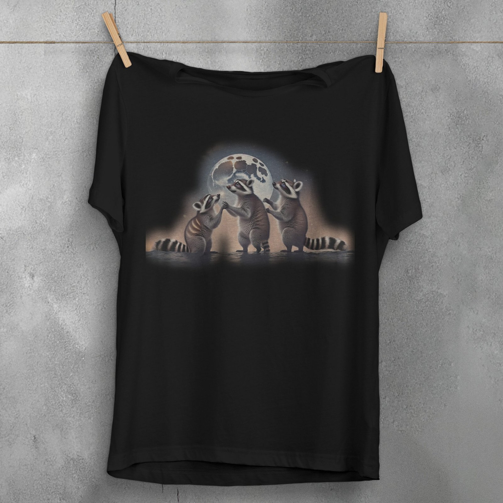 Three raccoons gather under the glowing moon. Their presence evokes a sense of curious wonder and playful magic. They gaze at the celestial sphere with a knowing spark. This imagery resonates with those drawn to the mysteries of nature and the allure of the night. Embrace the nocturnal charm and feel connected to the whimsical side of the wild. This is for those who find beauty in the unseen. The design celebrates animal familiars.