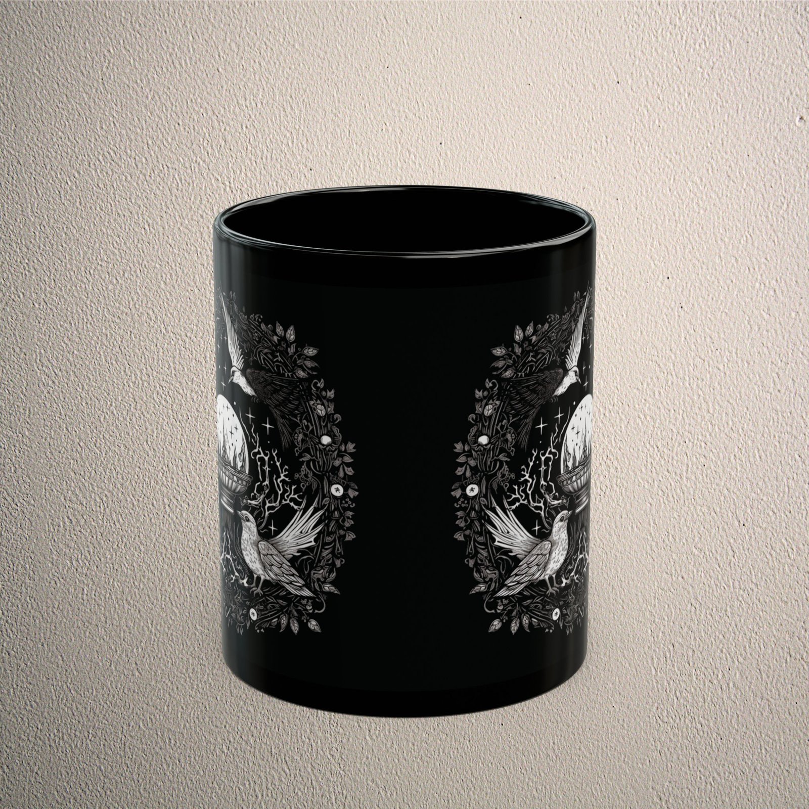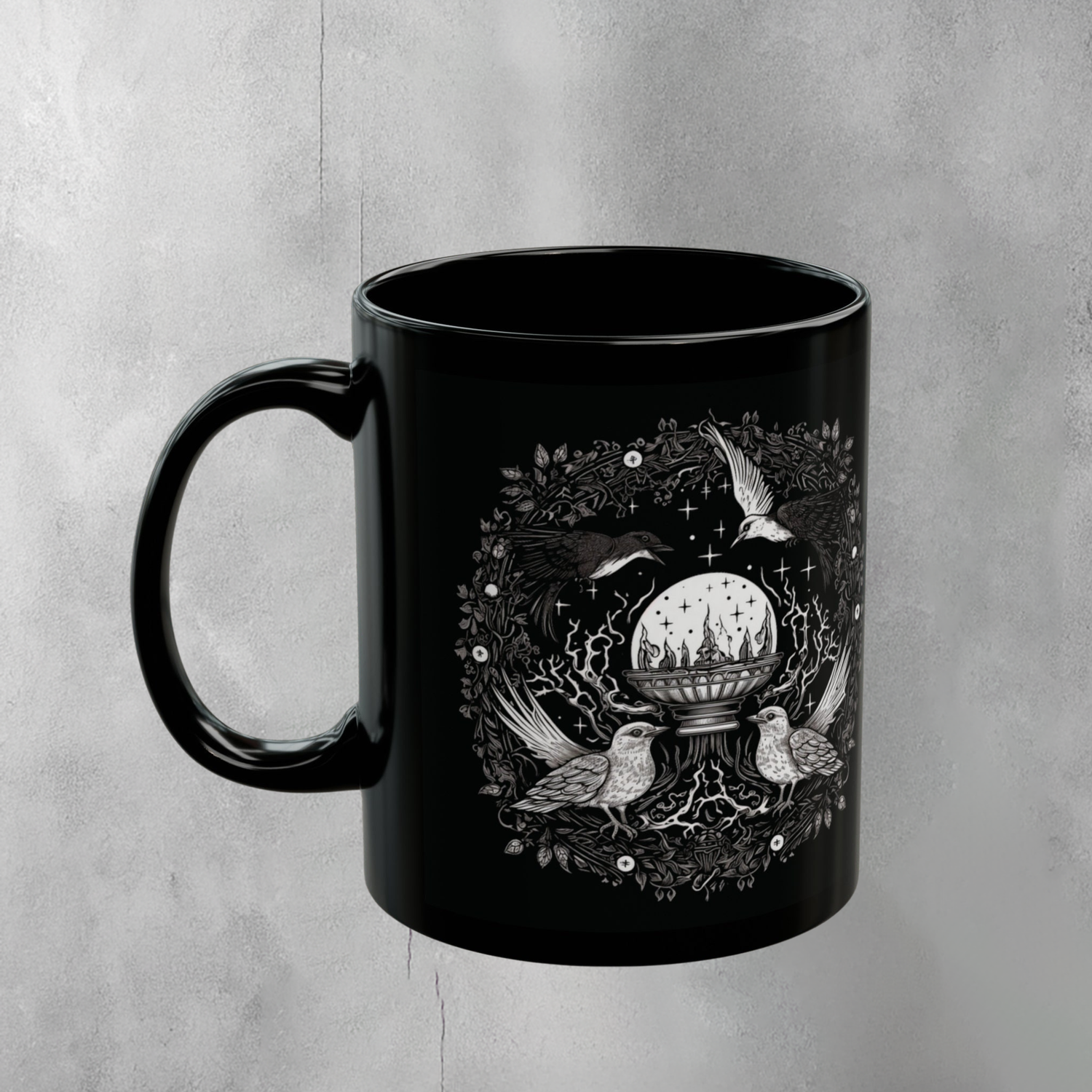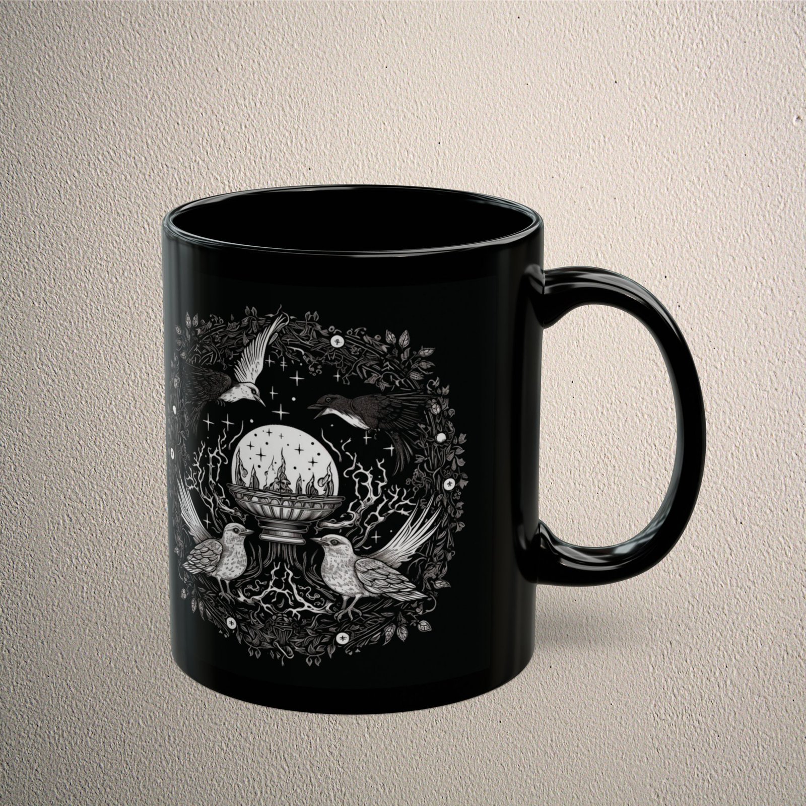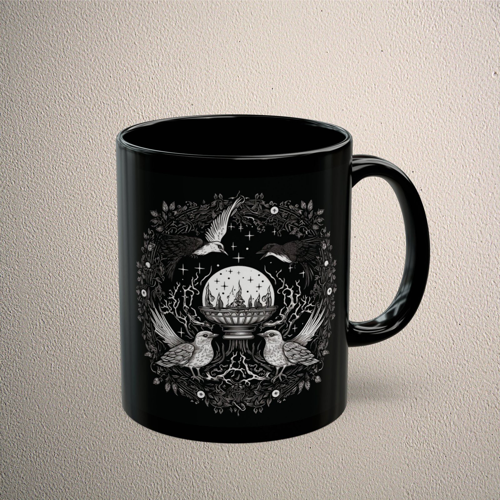 A gothic artistic vessel featuring birds and wreath. Let the birds guide you to see the future with a crystal ball. This ritualistic item is surrounded by dark magic and starry sky. An enchanting touch for those drawn to the mystical arts. The black tone emphasizes its air of mystery. It resonates with nature’s hidden knowledge and dark academia lovers. The Ogham.