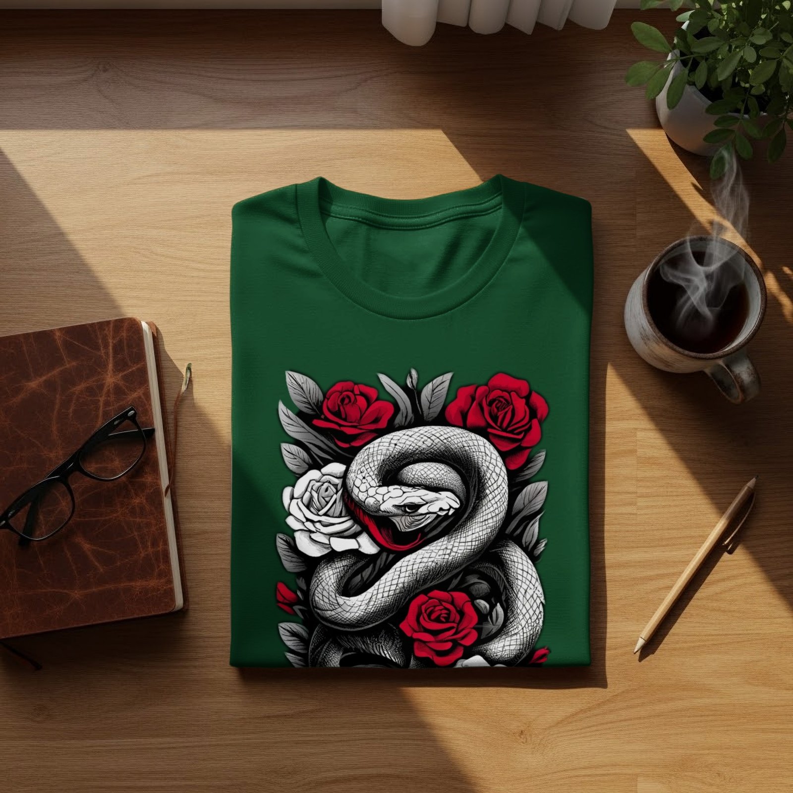 TheOgham presents a gothic and witchy piece featuring a serpent coiled among roses. Red and white blossoms intertwine with the snake’s form. The illustration evokes themes of transformation and hidden knowledge. Those drawn to symbolism and the darker aesthetic will connect with its subtle power. It whispers of secrets and blossoming mystery, a subtle charm for the enchantress. This artistic image captivates the gaze. It’s a statement of inner strength and enigmatic beauty.
