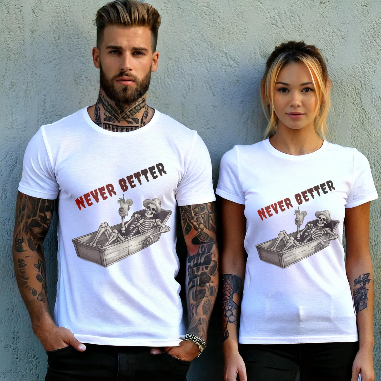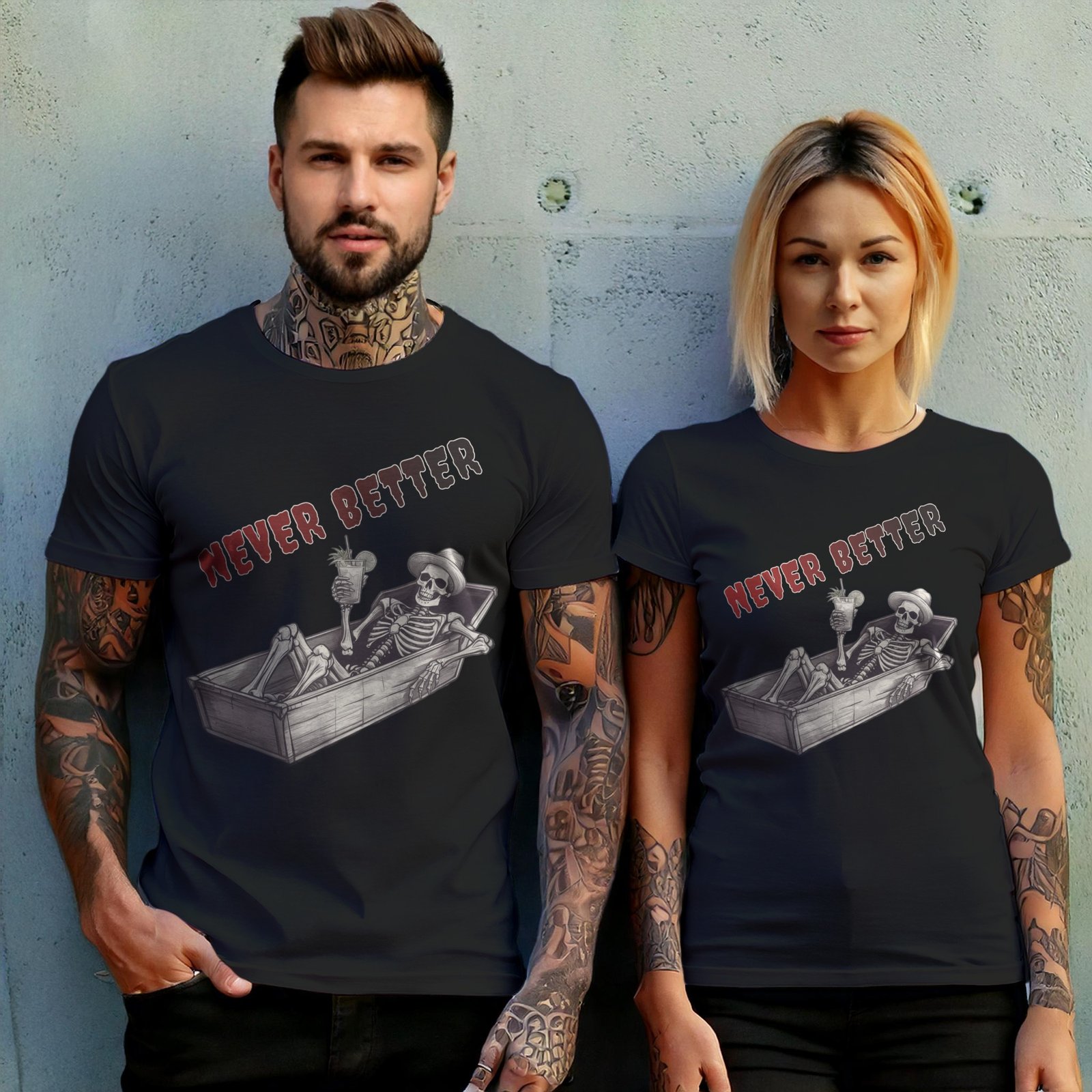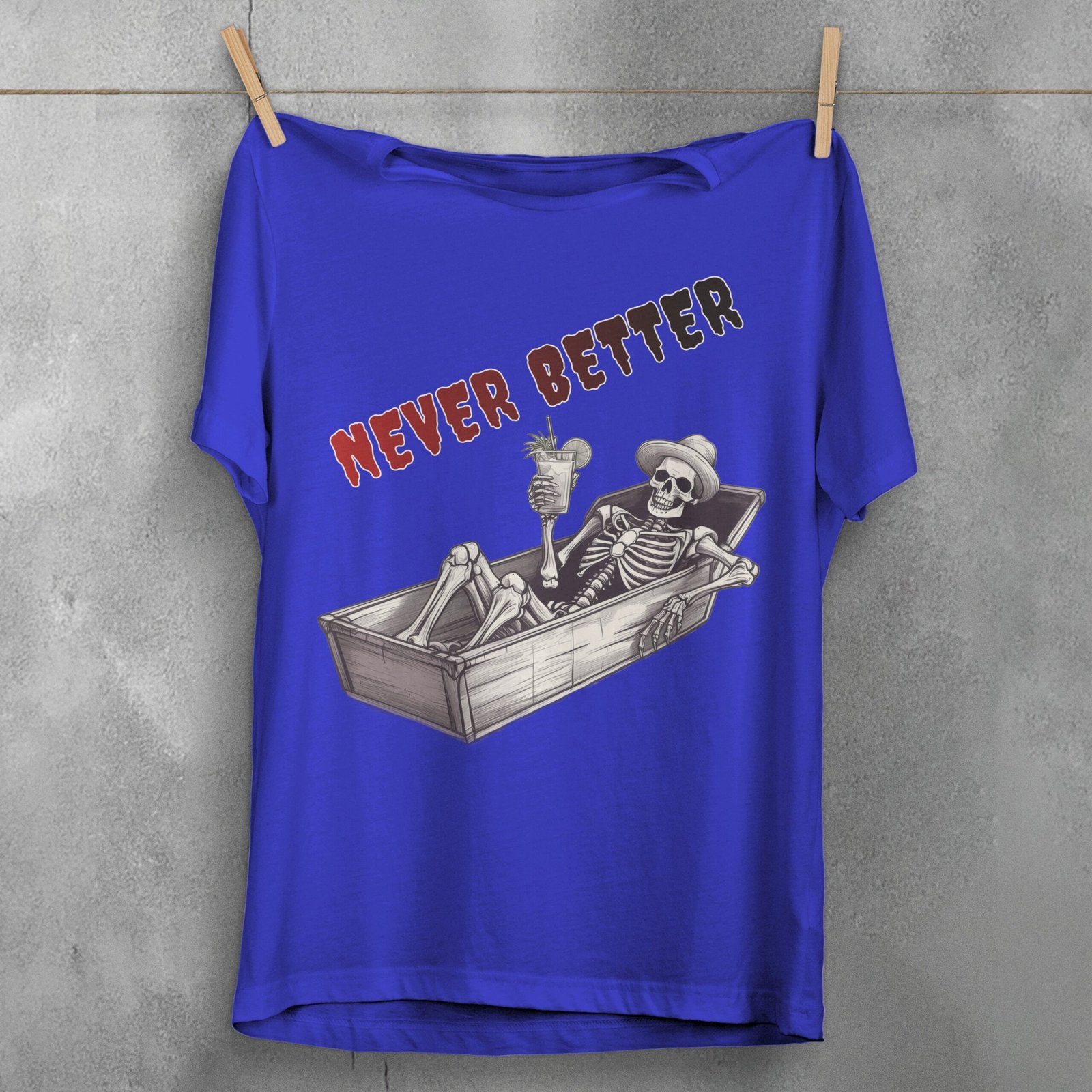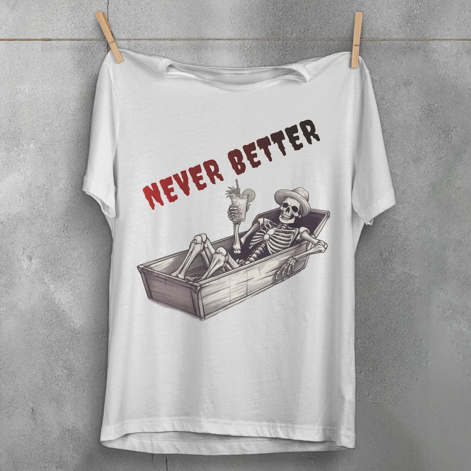 Find your morbid paradise with this unique TheOgham artwork. A skeletal figure reclines in a coffin, cocktail in hand, embracing the afterlife’s leisure. The words “Never Better” float above, a darkly humorous epitaph. It speaks to those who appreciate gothic wit and find beauty in the macabre. Channel your inner darkness, yet find some humor in it. It is also for those who find comfort in spooky styles. It offers a darkly peaceful sentiment for those with a flair for gothic artistry.