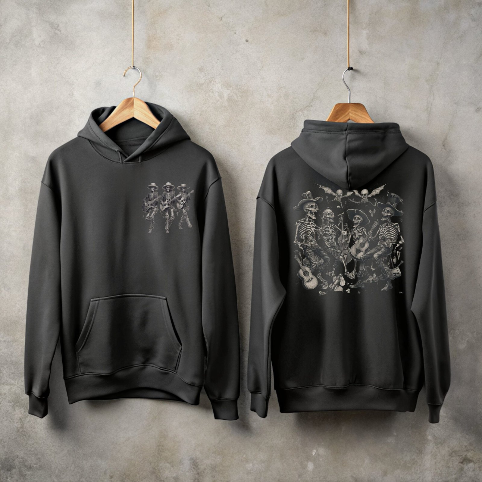 Embrace the echoes of mortality with this gothic-inspired garment by TheOgham. A skeletal band serenades the silence, their music weaving tales of life and beyond. This witchy piece calls to those who find beauty in the macabre. The artwork captures a timeless celebration, a reminder that even in death, art and rhythm endure. Perfect for lovers of Dia de los Muertos, dark art, and distinctive skeleton imagery. Let this comfortable piece be a symbol of your connection to the mystical. Feel the magic and mystery envelop you.