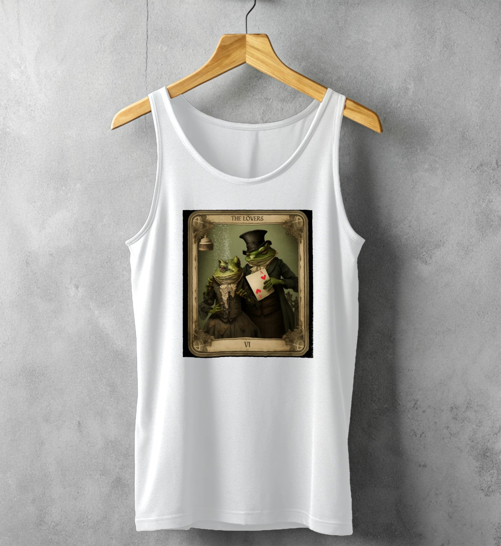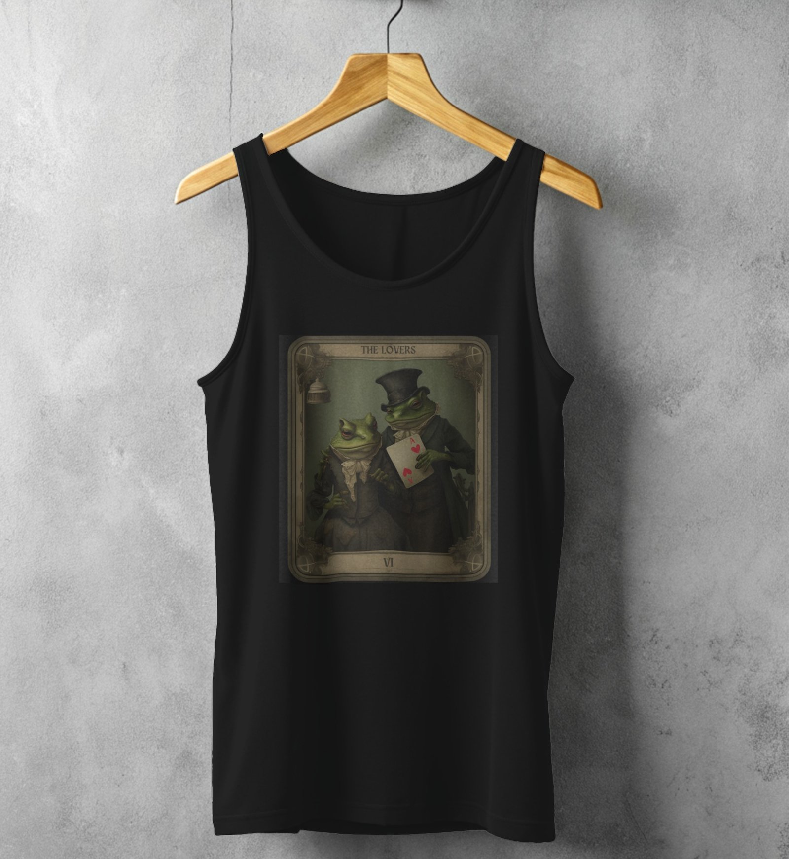Embrace destiny with TheOgham’s “The Lovers” tarot tank top. This unique artwork embodies the classic card with a gothic twist. Two elegant frogs are depicted as the lovers. The feeling is whimsical, romantic, and a touch mysterious. This card speaks to choice, harmony, and deep connection. It’s a beautiful image for those who embrace love’s enchanting path. Perfect for anyone who loves tarot and witchy style. This top resonates with the beauty and meaning of the Major Arcana.