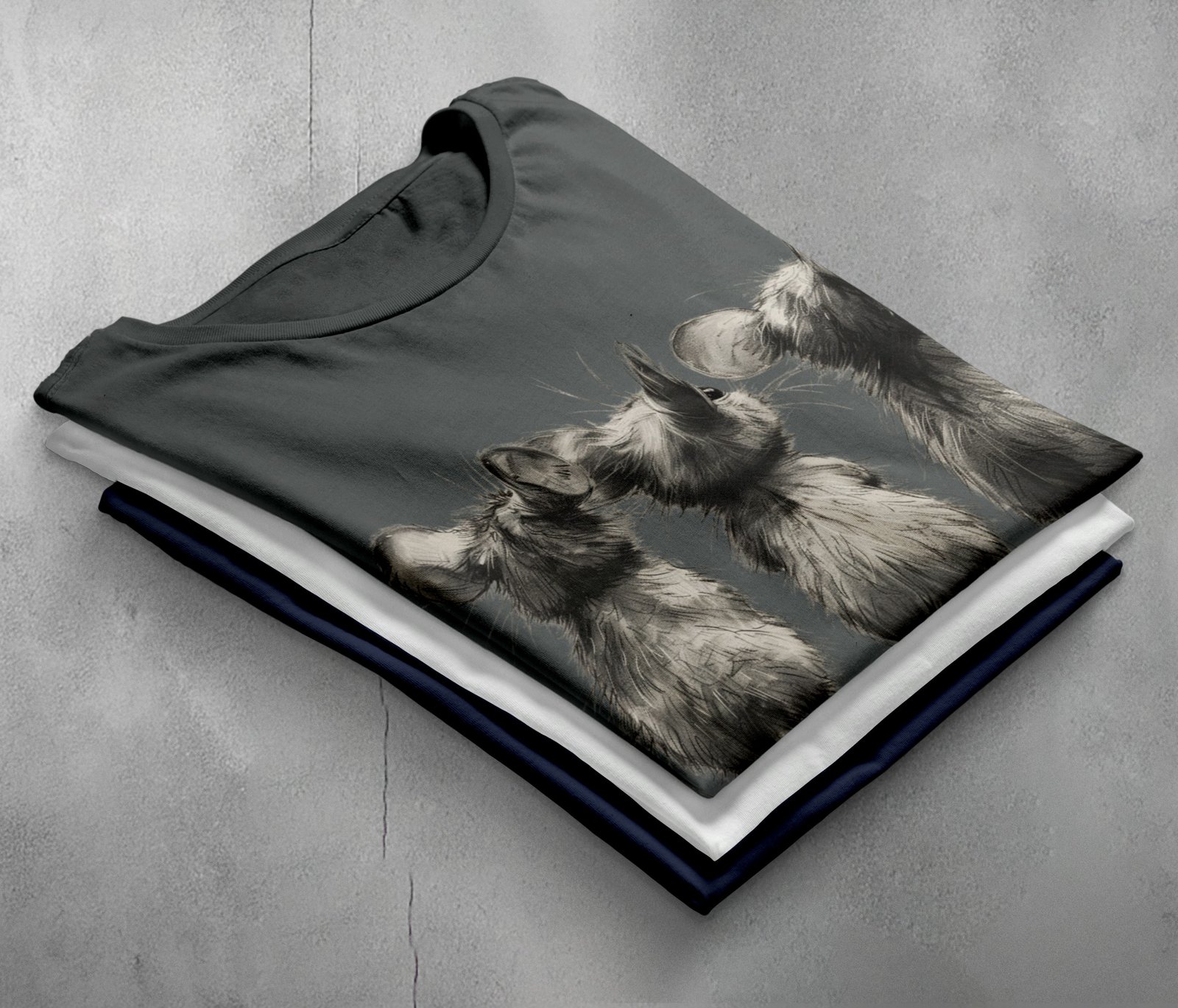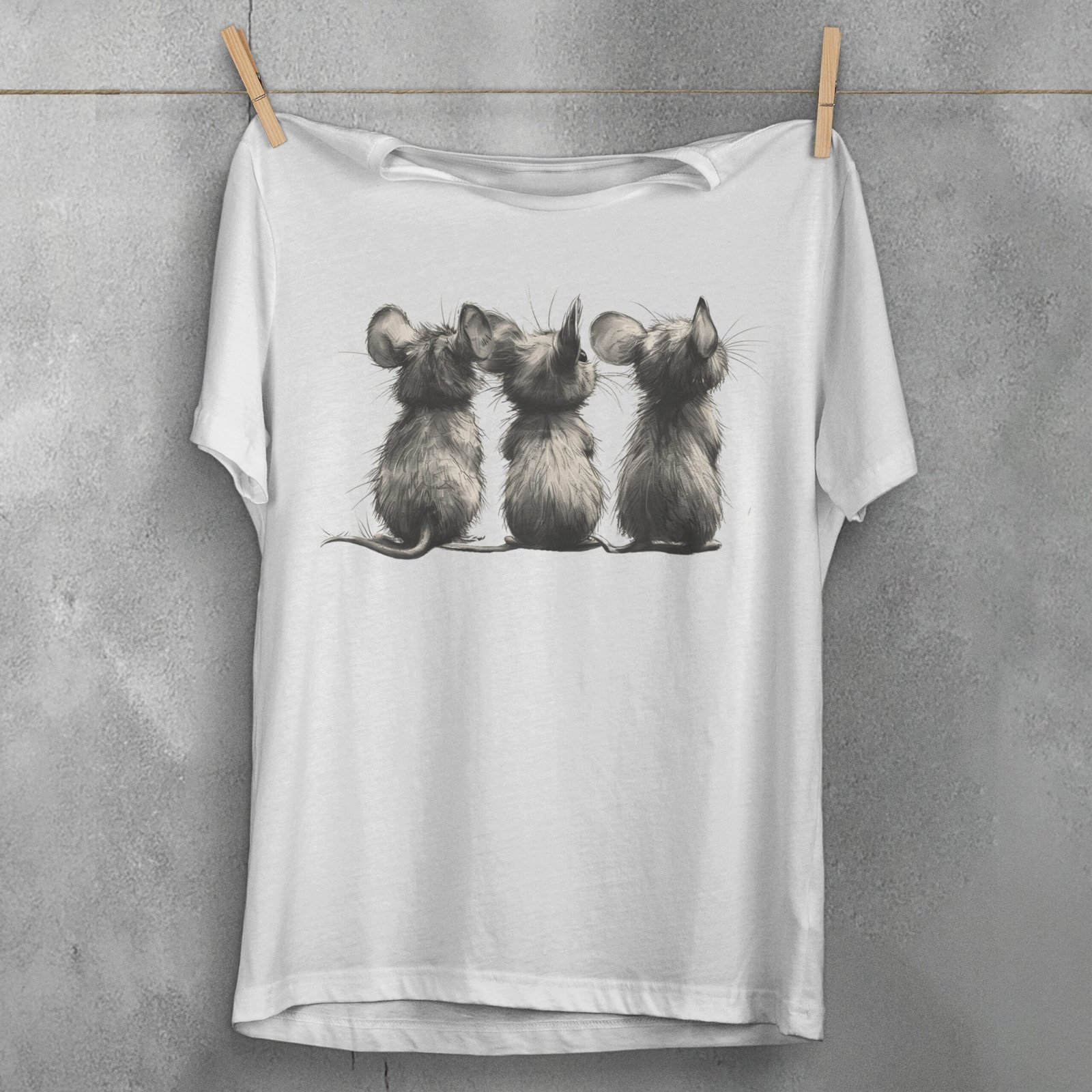 In this monochrome artwork titled “Three Whispering Mice,” three endearing rodents, rendered in delicate strokes of grey and black, each faces a different direction, seemingly caught in a silent, mysterious conversation. The scene evokes a sense of ancient wisdom and secretive whispers, perfectly suited for those who find beauty in the delicate balance between darkness and light. The intricate details of their fur and attentive postures suggest an almost magical awareness and curiosity, making it an ideal choice for those drawn to the mystical and the whimsical. The atmosphere conveyed by the illustration is one of quiet contemplation and subtle connection. It speaks to anyone who cherishes the quieter moments of reflection and the enchantment found in nature’s smallest creatures. This piece captures the essence of hush and harmony, making it a poetic expression of the gothic and the enchanting.