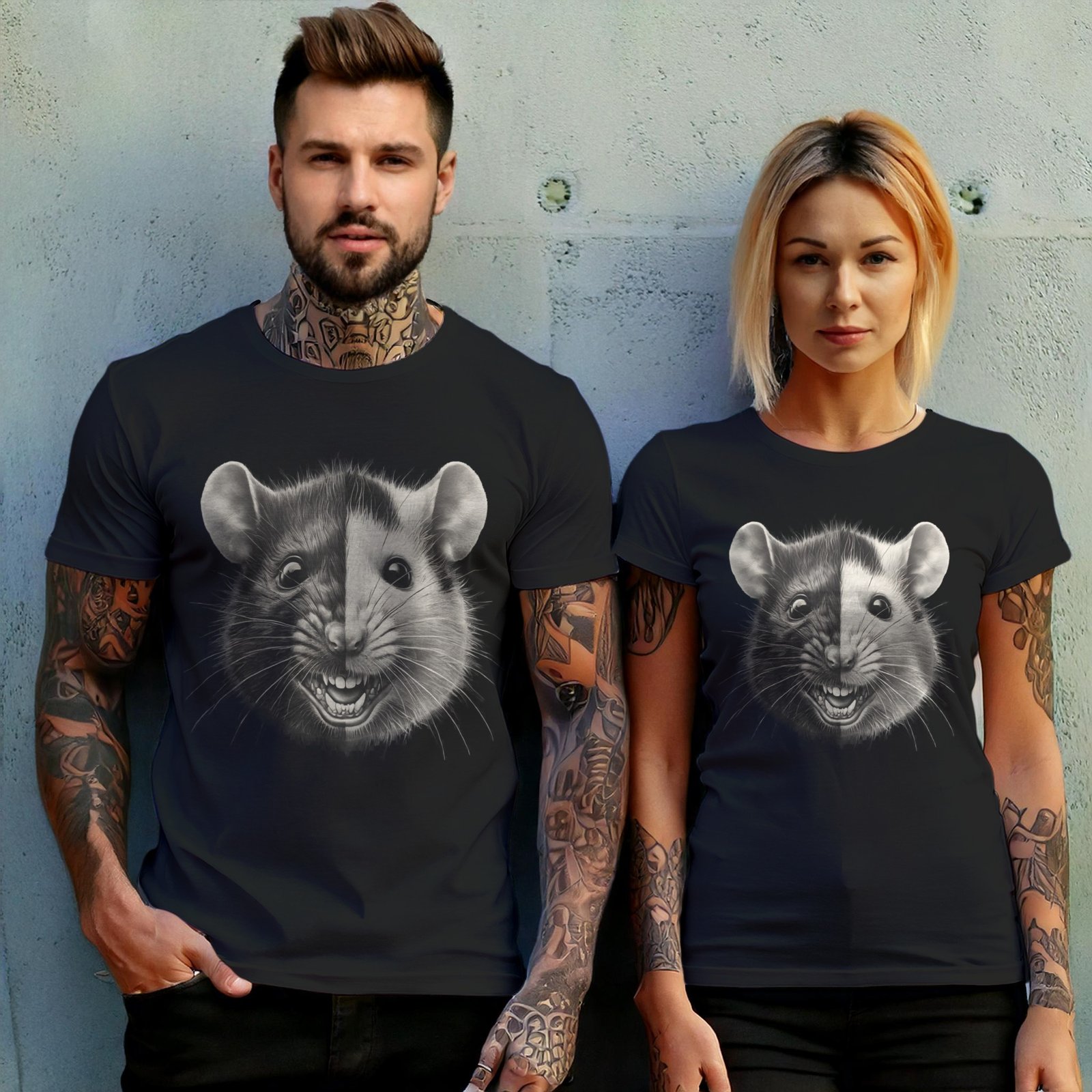 This intriguing design merges duality and emotion through the face of a rat that bridges both light and shadow in a symphony of contrasts. One side dark and intense, the other light and vibrant, it symbolizes the balance between the hidden and the revealed. The piercing gaze and expressive open mouth lend a sense of urgency and vitality, as if caught in a moment of transformation. Fans of the macabre and the mystical will resonate with its layers of meaning. The artwork evokes the mysterious nature of existence, the balance of primal instincts, and the reflection of inner conflicts. Perfect for those who explore the edges of whimsy and darkness, it turns a simple canvas into a powerful statement of individuality and depth.