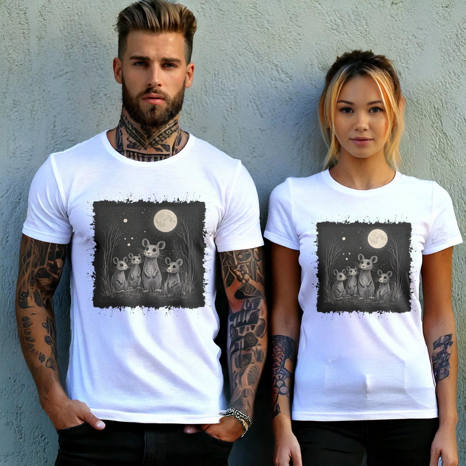 Beneath the haunting glow of a full moon, a family of mice gathers, their tiny forms bathed in celestial light. The night sky, speckled with distant stars, stands as a silent witness to their nocturnal gathering. Each mouse, with eyes wide open, exudes a sense of curiosity and wonder, embodying the mysterious allure of the night. The barren trees, silhouetted against the dark backdrop, add a touch of melancholy, evoking a sense of solitude and contemplation. This design conjures the enchantment of the witching hour, perfect for those who find solace in the quiet tranquility of the night. It speaks to the dreamers, the stargazers, and the wanderers who revel in the beauty of nature’s dark corners and the mysteries they conceal.