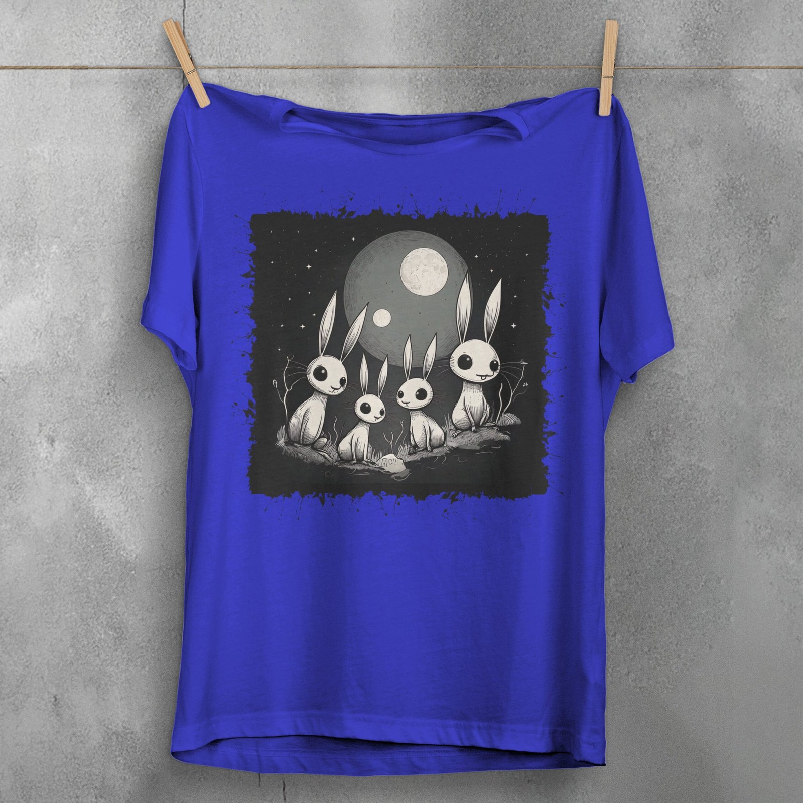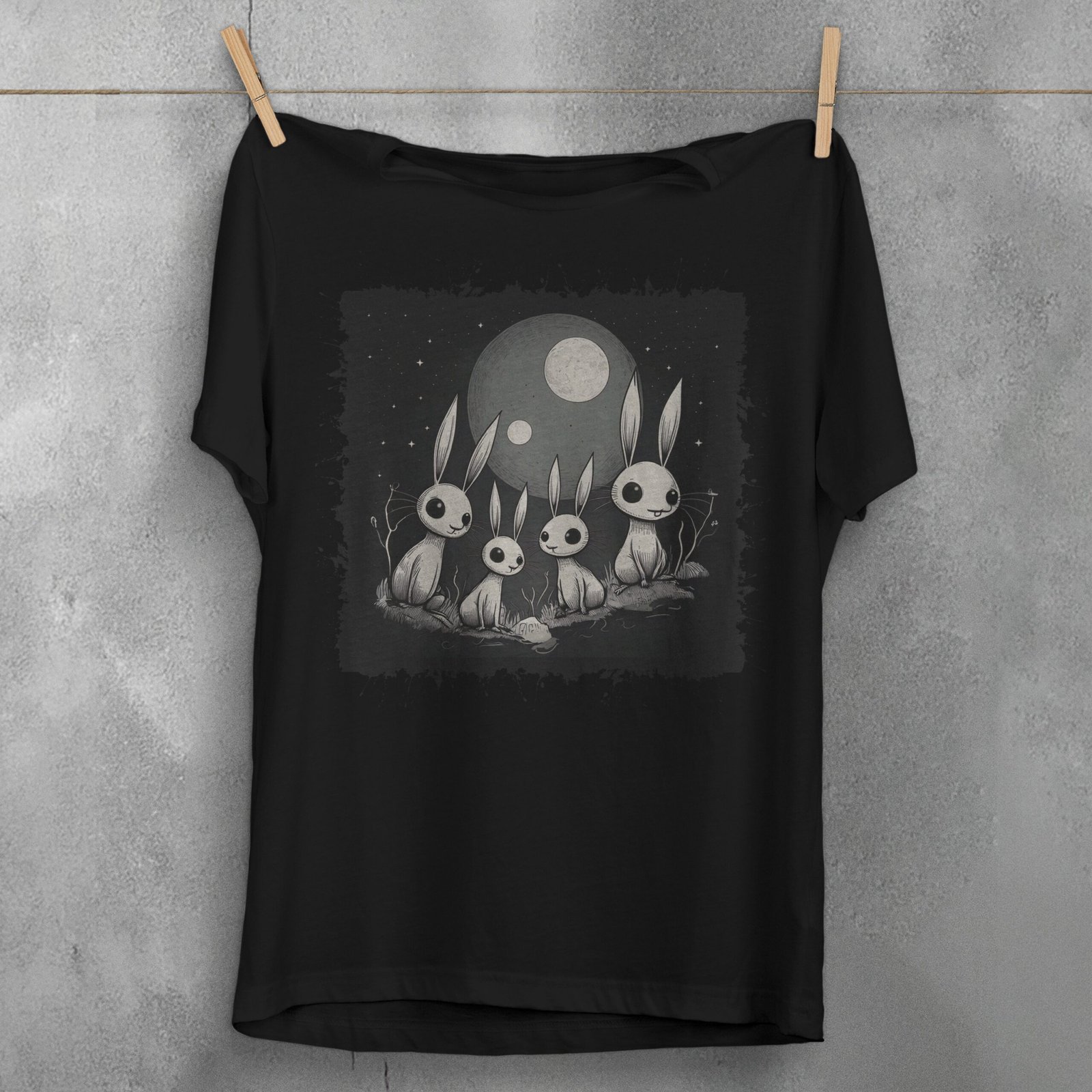 Embrace the enchantment of night with this gothic bunny artwork. A quartet of ethereal rabbits gather beneath the watchful moon, set against a backdrop of starlit skies. This witchy art evokes a sense of mystery and quiet wonder. It speaks to those drawn to moonlit nights and gentle, strange creatures. It reflects a love for the whimsical yet subtly dark side of nature. An ideal choice for the artistic soul and the lover of gothic imagery.